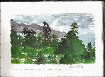Esta aguarela foi feita no alto do Monte da Guia no parapeito do adro da capelinha. Estava muito vento, a "Nadine", a tempestade tropical que me pregou um grande susto, aproximava-se. Enquanto a fiz durante umas longas 3h pensava nos ensinamentos do Cláudio e nas suas magníficas panorâmicas.