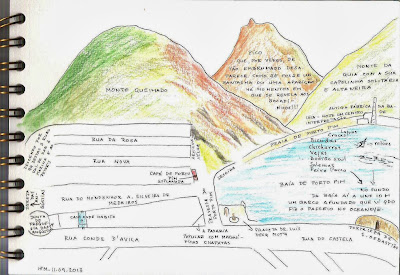 Resolvi fazer um mapa, à minha maneira, do local de Porto Pim na cidade da Horta. Talvez um dos meus amigos arquitectos um dia me explique como faria um verdadeiro mapa. Até lá governei-me com a prata da casa da minha cabeça.