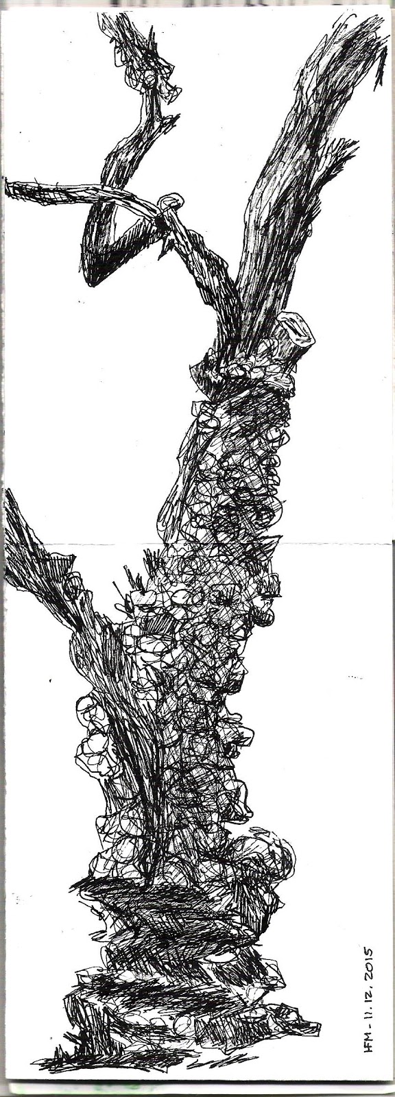 A árvore que vou desenhando pois nunca sei quando a encontrarei no chão. Feita no sábado de manhã com o sol a bater-lhe. Está negra e cada vez mais tombada. Os meus registos são o meu agradecimento por ela ter encantado o meu olhar há mais de duas décadas.